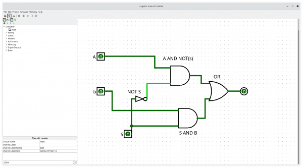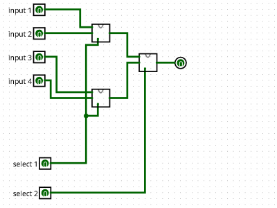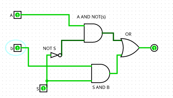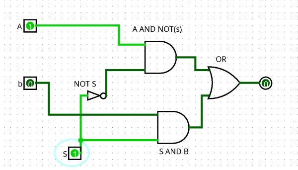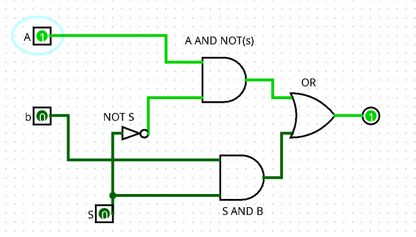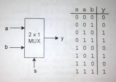 Poniżej przedstawiony jest multiplekser 2×1. Posiada on dwa wejścia a i b i jedno wejście s, nazywane sterującym lub z angielskiego select czyli wybór. Jego działanie jest bardzo proste. Jeśli wejście select ma wartość zero, na wyjście przekazywana jest wartość z wejścia A. Jeśli wejście select ma wartość jeden, na wyjście jest przekazywana wartość z wejścia B.
