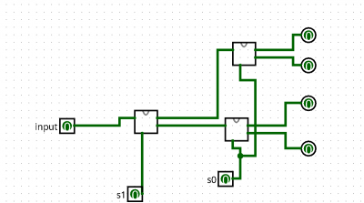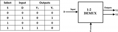 Demultiplekser 1×2 ma jedno wejście, które w zależności od wejścia s, zostaje przekazane do jednego z dwóch wyjść.