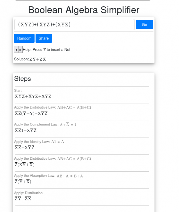 Powyższe wyrażenie rozwiązane przez https://www.boolean-algebra.com/ z wytłumaczeniem kroków. Polecam stronę.